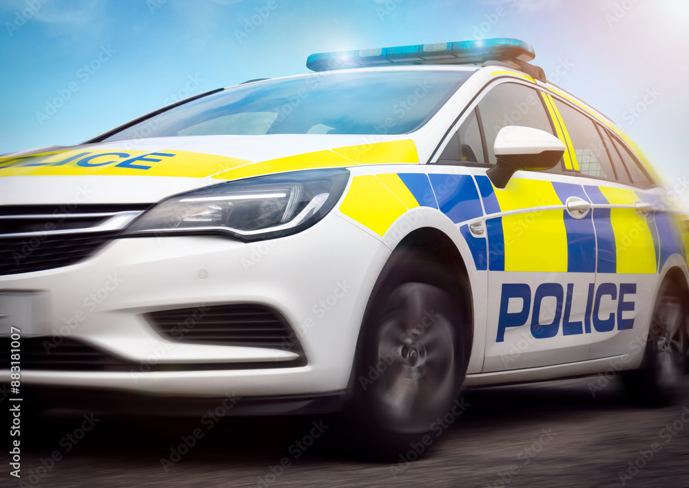 Police car - scene of emergency services' police force vehicle in action featuring a cop car with lights and siren on, travelling at high speed in response to an incident.