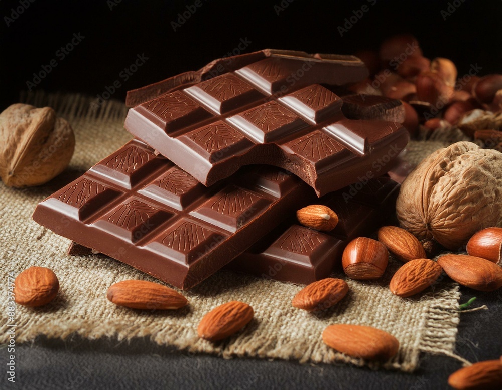 Barras de chocolate con nueces avellanas almendras con fondos negros , luz de estudio