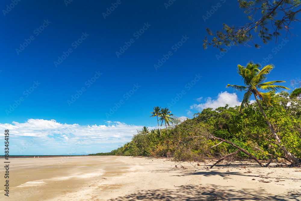 Picturesque tropical coastal sandy beach in Cape Tribulation, Queensland, Australia. Cape Tribulation is within Daintree National Park on Coral Sea.