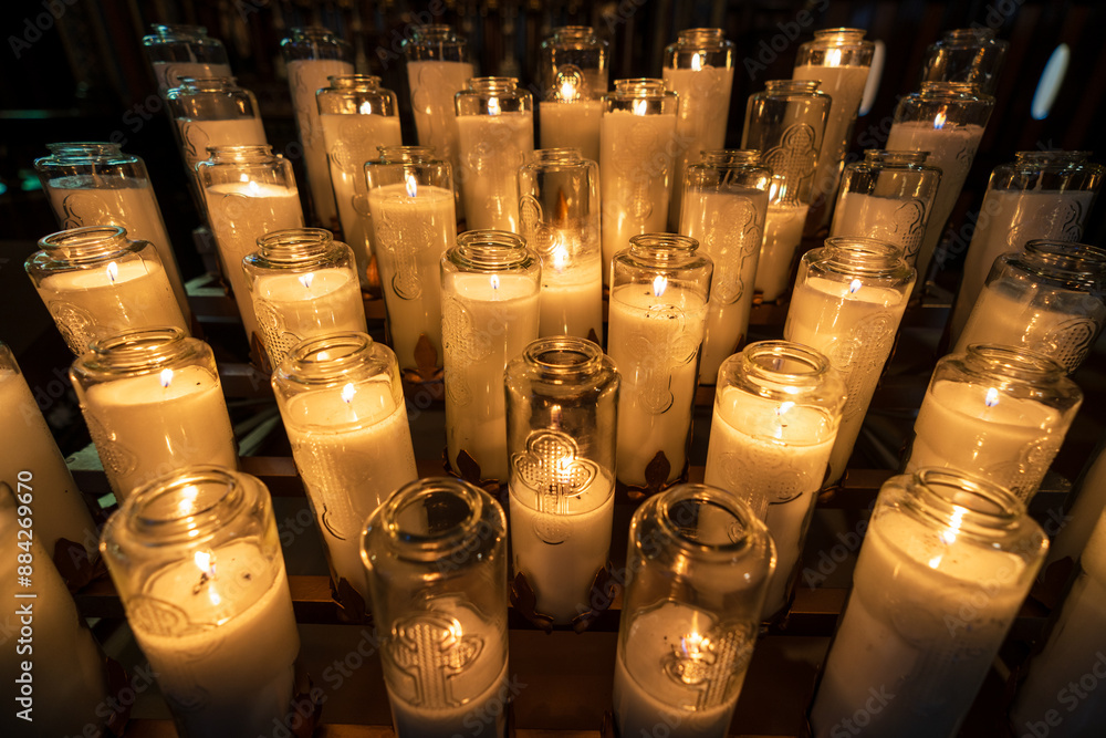 Rows of white lit votive candles or prayer candles in church. Notre-Dame Basilica. Montreal, Quebec, Canada.
