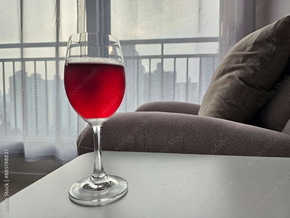 커튼이 있는 창가와 소파, 흰색 테이블 위 와인잔에 있는 레드와인 또는 과일음료