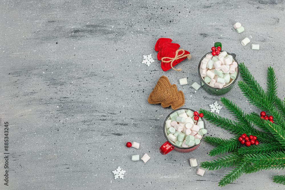 Hot cocoa or chocolate with marshmallows. Christmas traditional decor, New Year festive arrangement