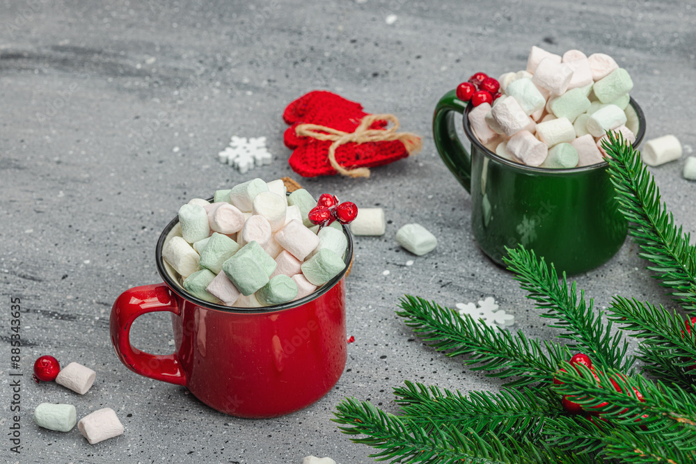 Hot cocoa or chocolate with marshmallows. Christmas traditional decor, New Year festive arrangement