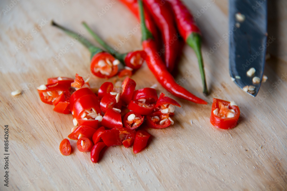fresh raw red hot chili peppers on wood