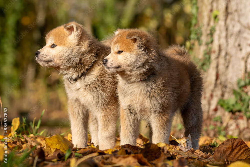 portrait de deux chiots akita en forêt debout près de l'un de l'autre