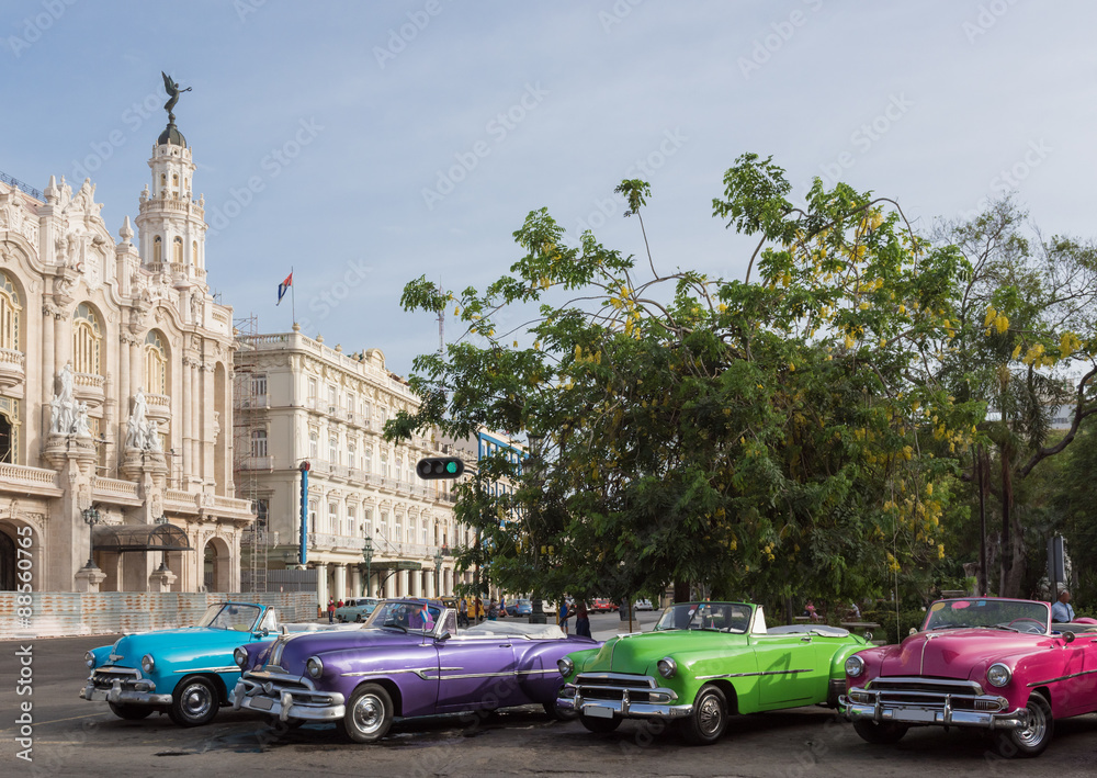 Kuba amerikanische Oldtimer parken in Reihe vor dem Gran Teatro in Havanna auf der Strasse