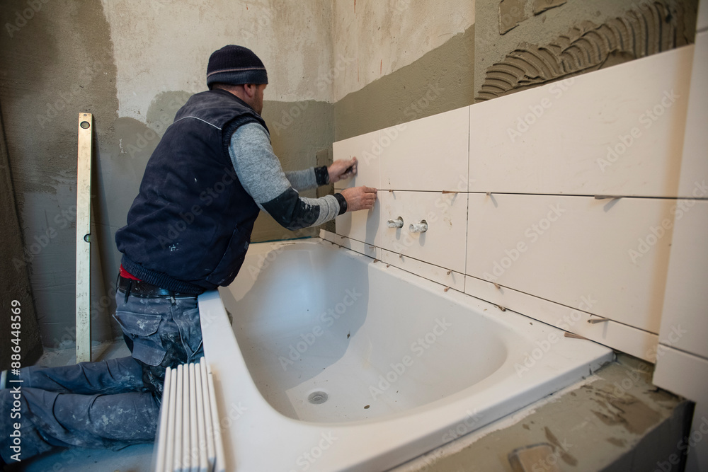 In einem Neubau klebt ein Bauarbeiter und Fliesenleger neue Fliesen an die Wand von einem Badezimmer