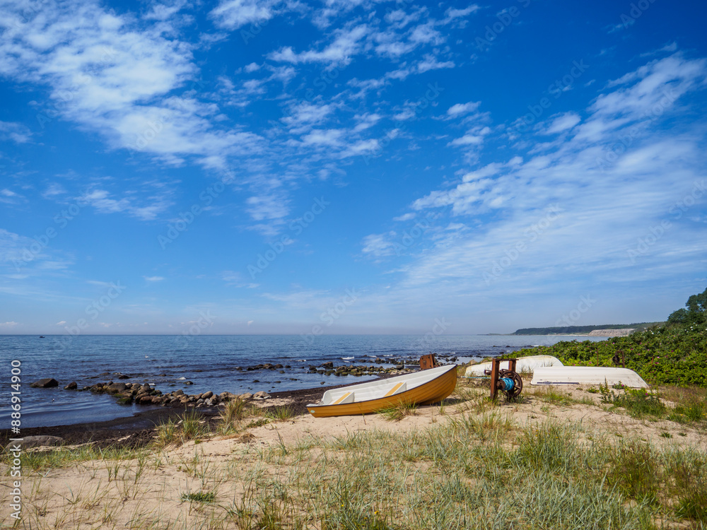 einsamer Strand auf Bornholm mit kleinem Boot