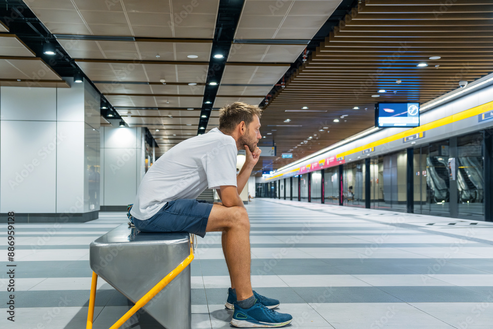 Young thoughtful tired man sit in empty hall of metro station waiting for subway train. Exhausted male gets home by public transport late at night after long working day. Lifestyle concept