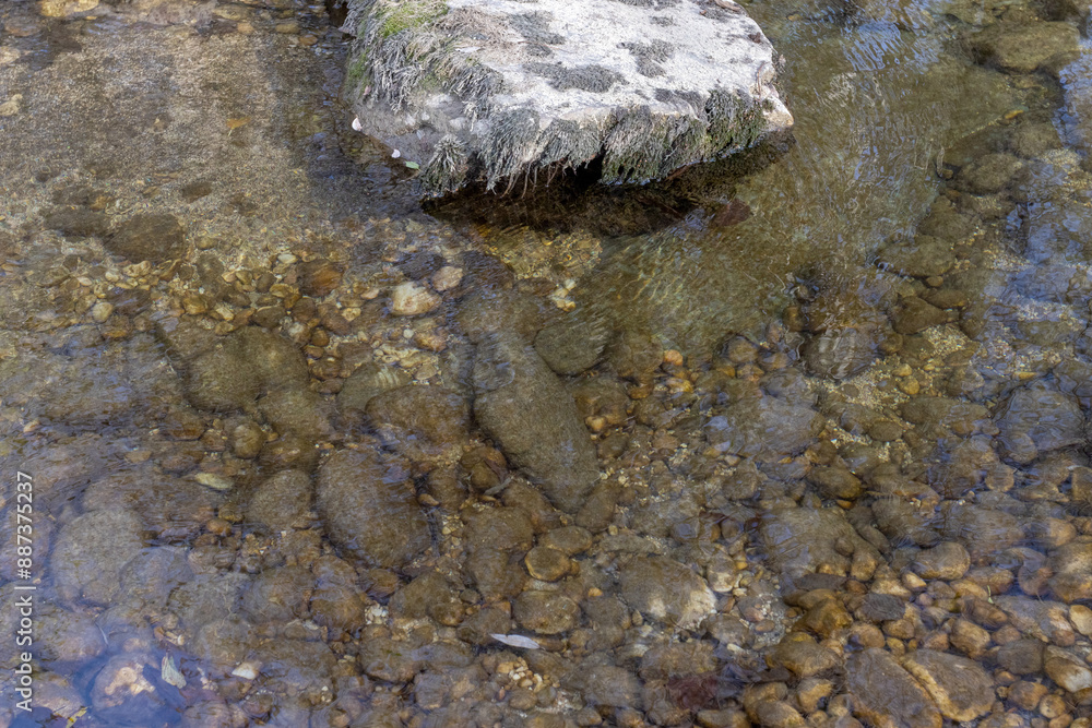 A shallow riverbed with an exposed rocky bottom, a small stream and a flow of water, autumn in nature