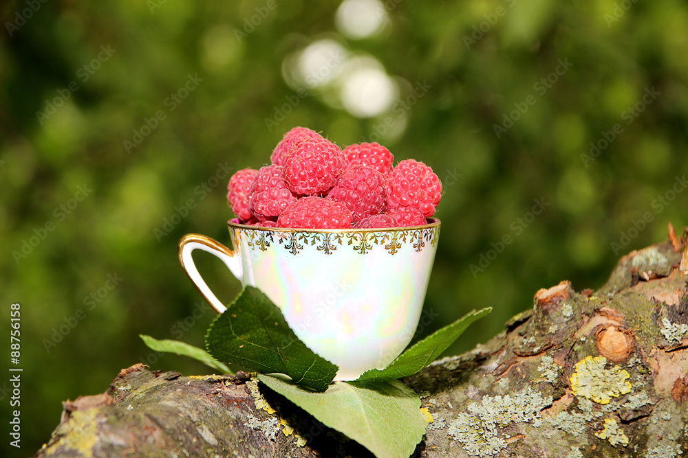 A cup of tasty raspberry on nature background. Harvest raspberry