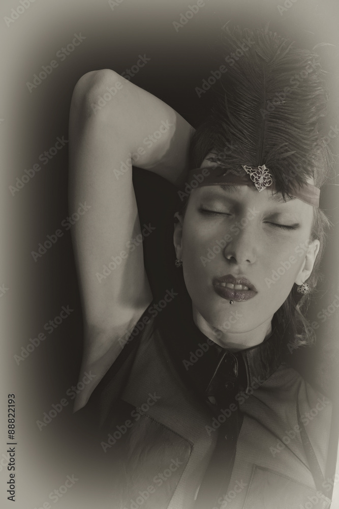 Portrait of a cabaret dancer wearing a headdress with a feather
