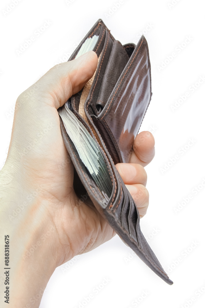 Dollars money in your wallet and hands on a white background