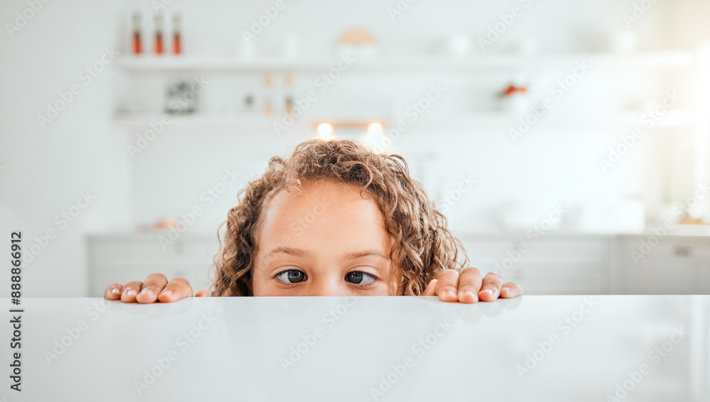 Girl, child and peeking by counter in kitchen for curiosity, snack time and food for eating or playful. Female kid, looking and naughty in home for sneaky or mischief, expectation and adorable.
