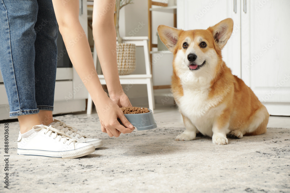 Woman with bowl of dry food feeding her cute Corgi dog in kitchen at home