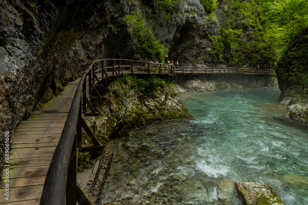 Vintgar Gorges Park a few km from Lake Bled, Slovenia. Wooden walkways accompany the path above the river rapids and waterfalls. River hits rocks and creates fog.Adventure family holidays. Freshness.