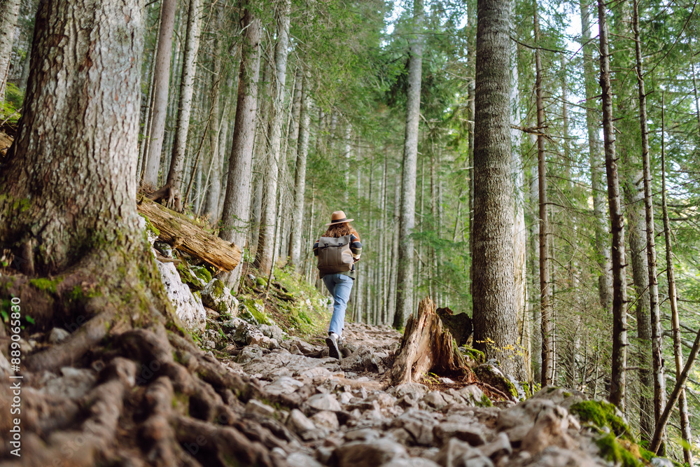 Active woman go hiking and walk along the trail in forest. Female hiker explore woodland. Nature, travel, rest concept.