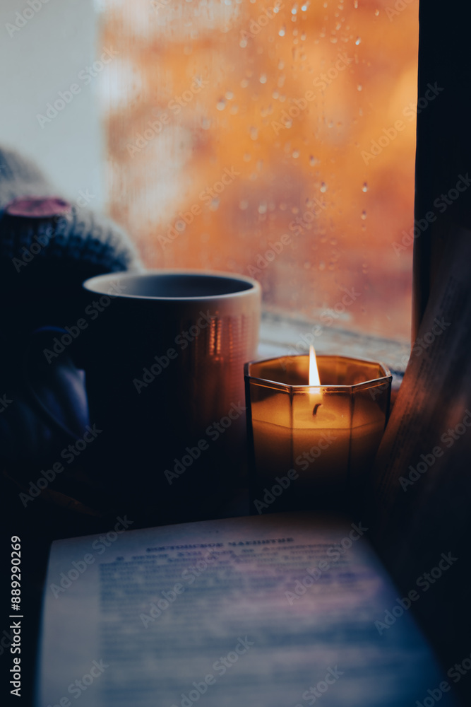 A burning candle on the window is autumn . the comfort of home . autumn comfort . autumn mood. The chondra .