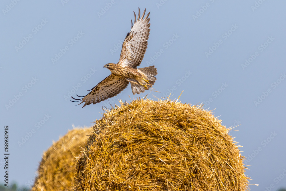 A common buzzard watching prey from a straw bale