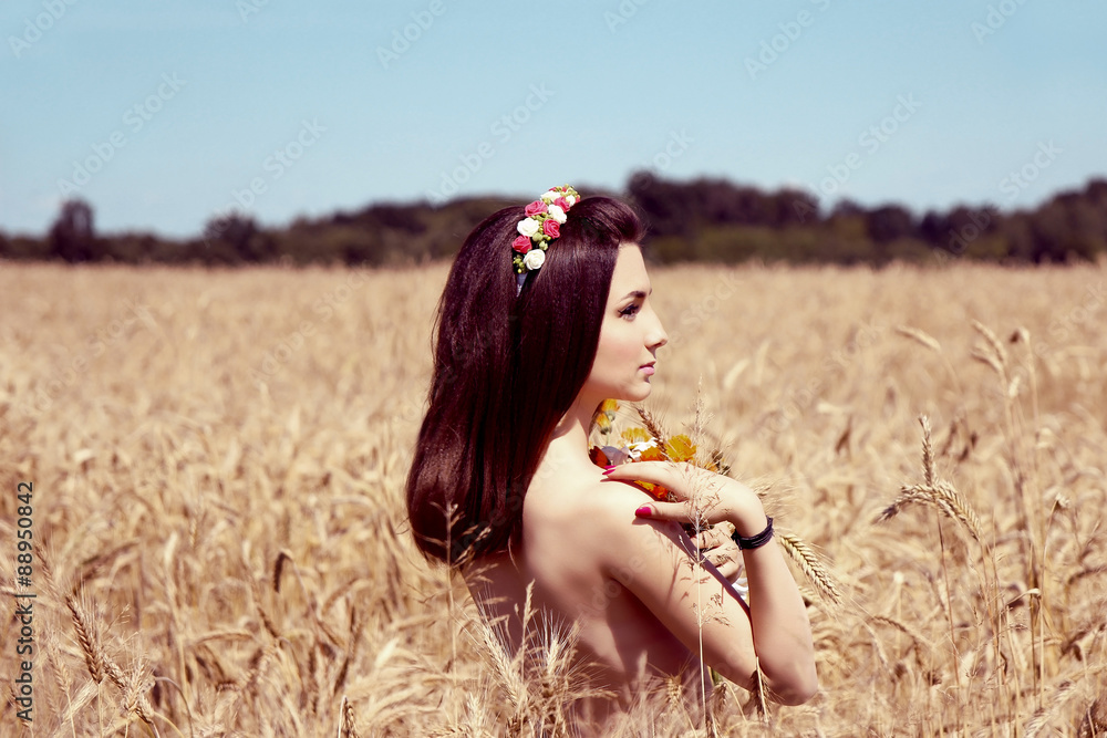 Young romantic girl with long brown hair in wheat field. Freedom. Profile face. Nude model. Slender girl with good figure. Vintage