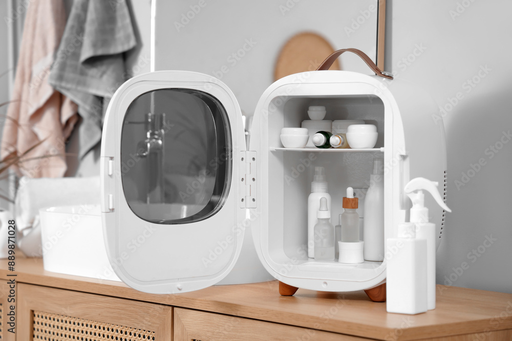 Small refrigerator with cosmetic products on cabinet in bathroom, closeup