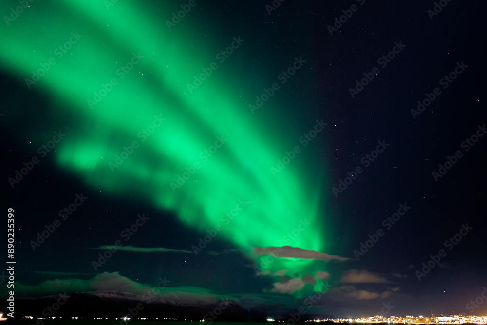 Amazing northern lights with starry sky. Aurora borealis in Reykjavik, Iceland