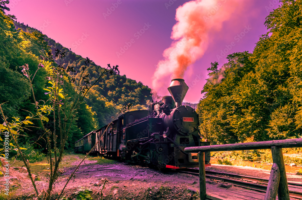 Old black steam powered railway train. Restored old vintage steam train built at Resita, Romania.