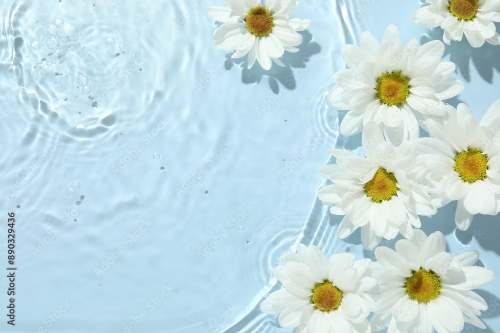 Beautiful daisy flowers in water on light blue background, top view. Space for text