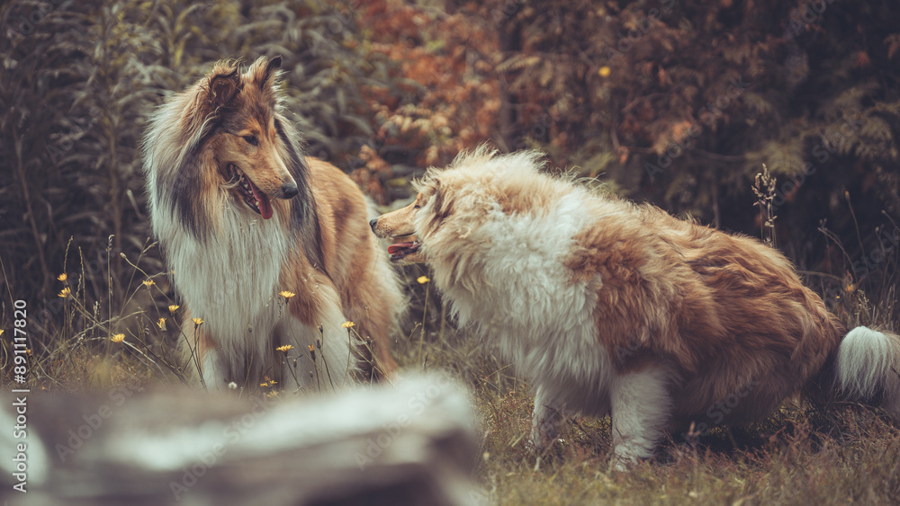 2 rough Collies Langhaar sable schottisch outdoor im Sommer miteinander spielend Var. 9