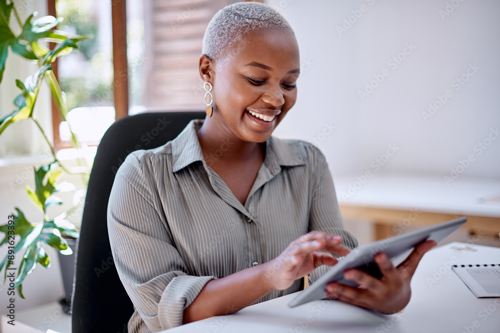 Working, black woman and tablet with ideas as intern, junior and financial advisor in insurance company. Female person, serious and tech in office, building or firm as professional in business or job
