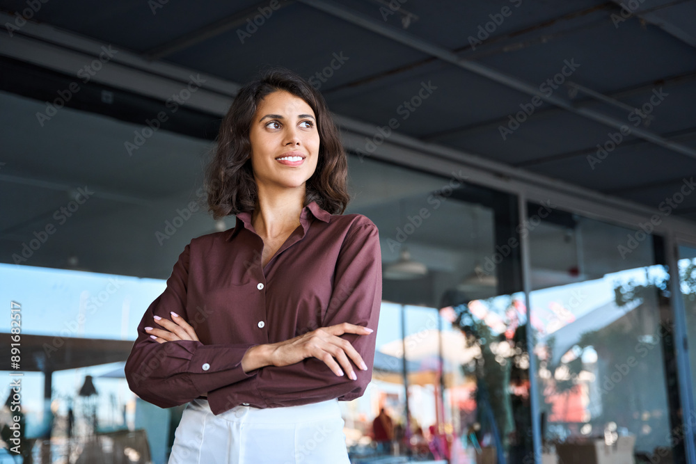 Latin or eastern middle age female ceo leader businesswoman standing in office. Portrait of beautiful successful hispanic young business woman with crossed arms looking confident aside. Copy space