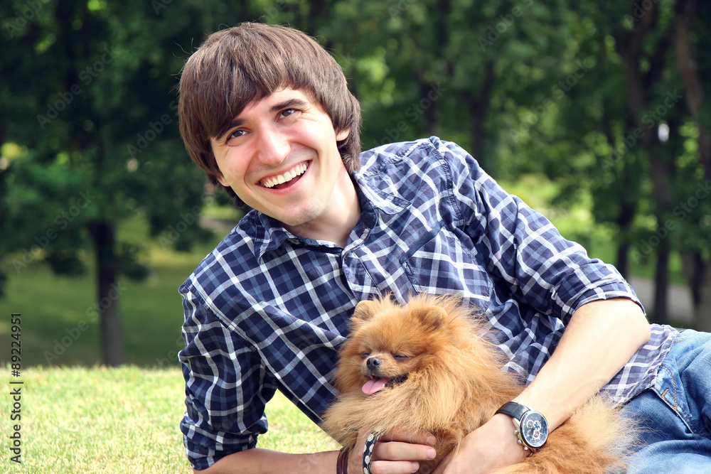 Handsome happy man with white beautiful smile with cute pomeranian dog lying on the green grass. Man and his lovely dog. Love of animals. Dog man's best friend. Happy man