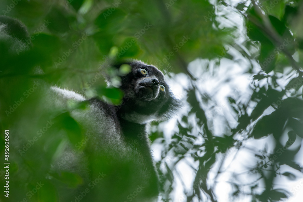 Female adult indri foraging in high canopy at Anamalazaotra forest reserve, Andasibe, Madagascar, Africa