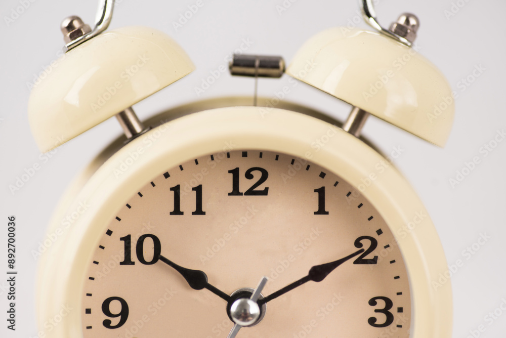 A large analog alarm clock on a white background. The idea of deadlines and hard work. Waking up at 10 a.m. A place for the text