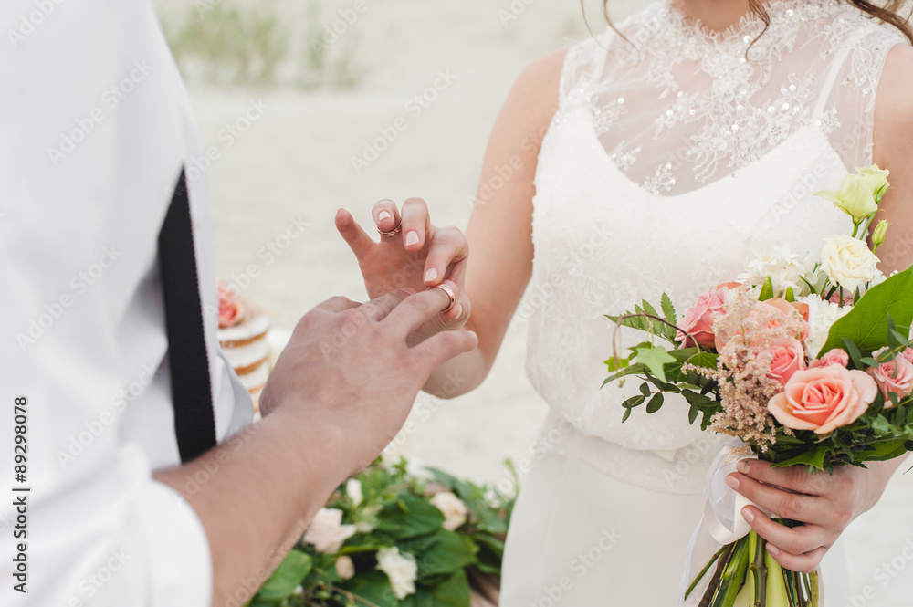 Bride wears the ring on the finger of the groom