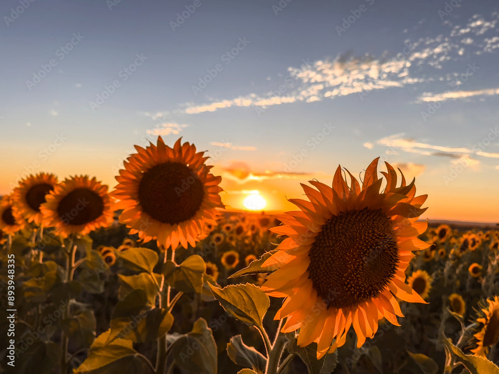 Beautiful sunflowers at sunset with yellow petals, raw material for sunflower oil and sunflower seeds in the sunflower field