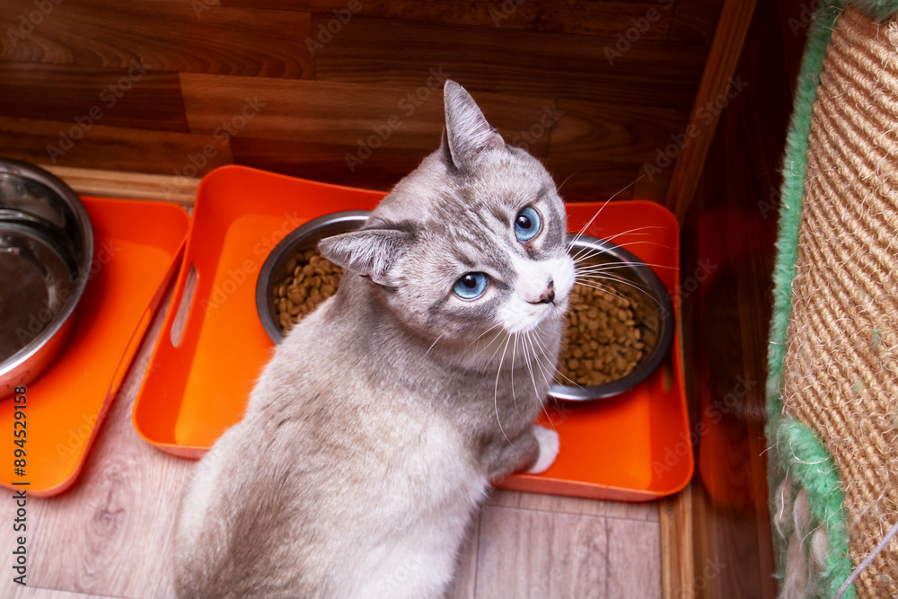 Next to the food bowl, a domestic cat is resting comfortably