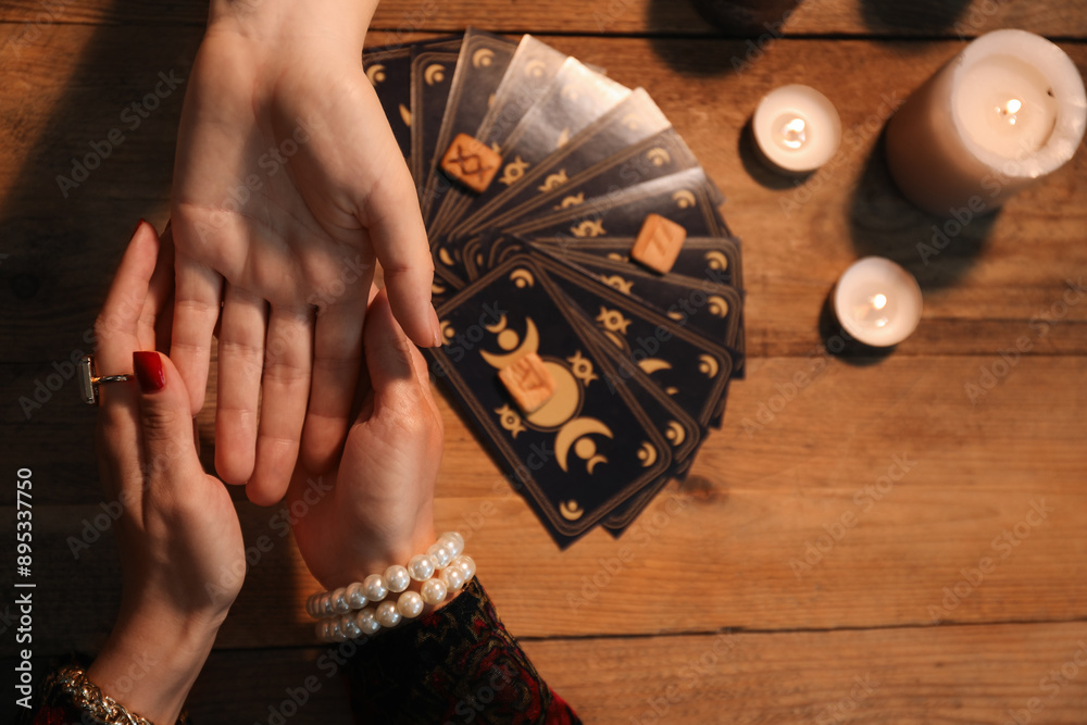 Fortune teller reading lines on woman's palm at wooden table, top view. Chiromancy