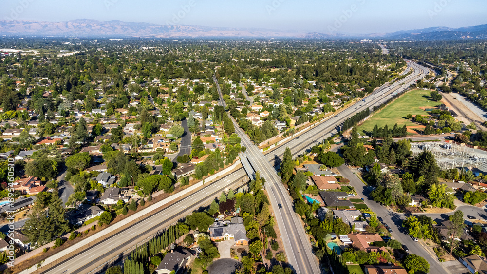 Aerial view of Highway 85 cutting through a residential neighborhood in Saratoga, California, framed by distant mountains surrounding Silicon Valley