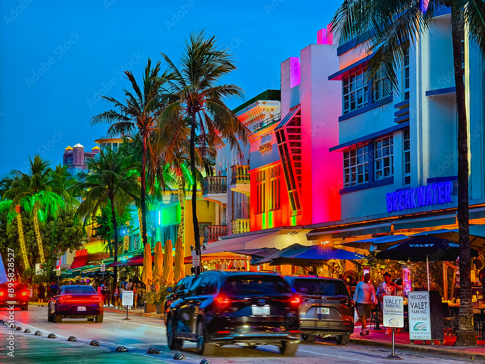 Miami Beach, Florida - July 8, 2024: Vibrant nightlife on Ocean Drive in South Beach, Miami