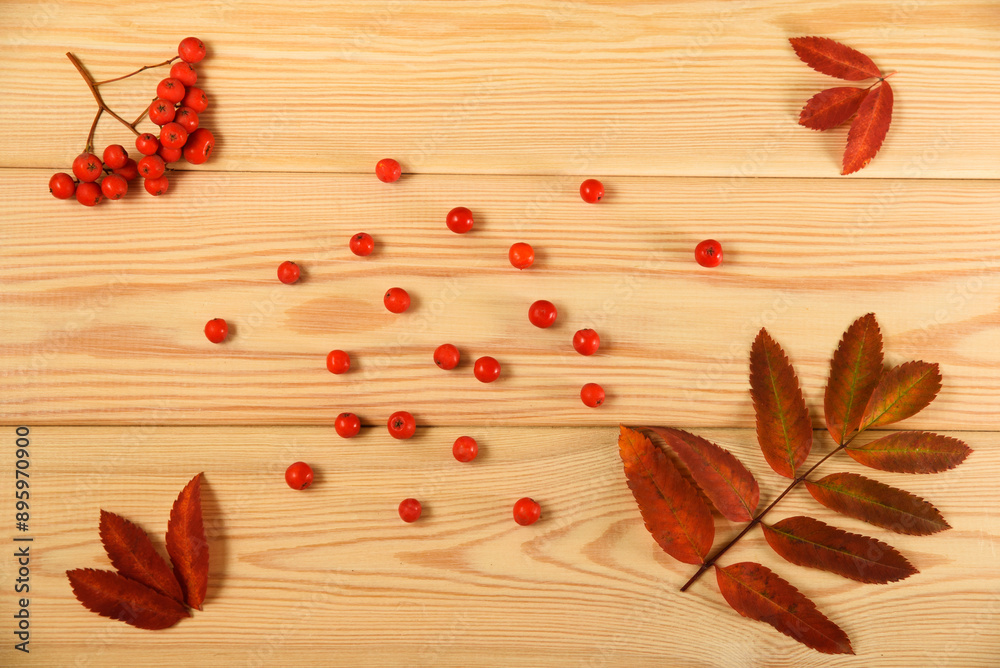 Autumn leaves on a wooden table. The layout consists of autumn elements. autumn leaves and clusters of mountain ash on a wooden board. Flat layout. View from above.
