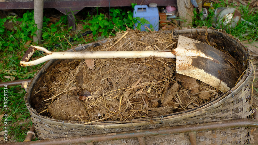 A rustic shovel resting on a pile of soil and straw in a woven basket, set against a backdrop of lush greenery.