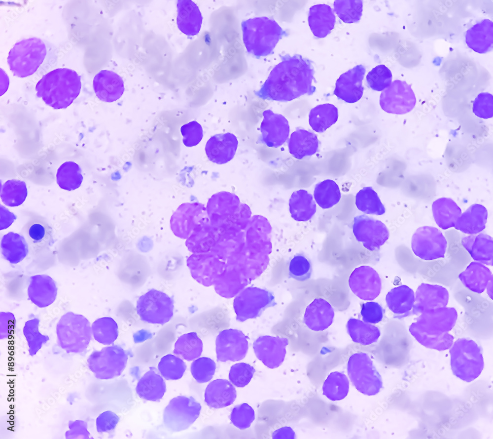Bone marrow study smear picture of Acute Myeloid Leukemia, Blast cell, Granulopoiesis. Hematology. Blood cancer.