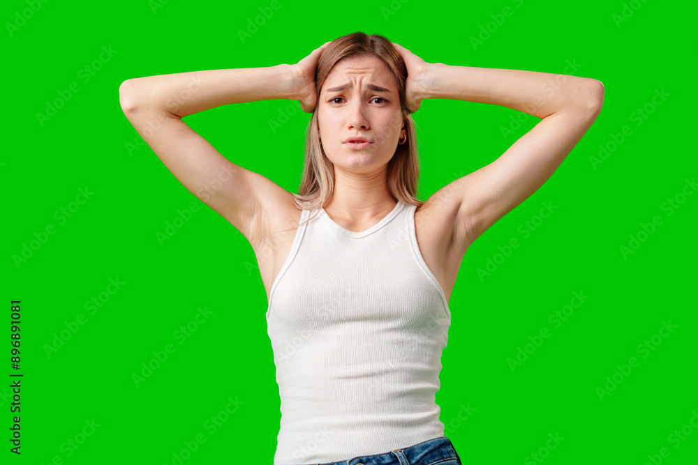 Young Woman Holding Her Head in Frustration Against Green Screen