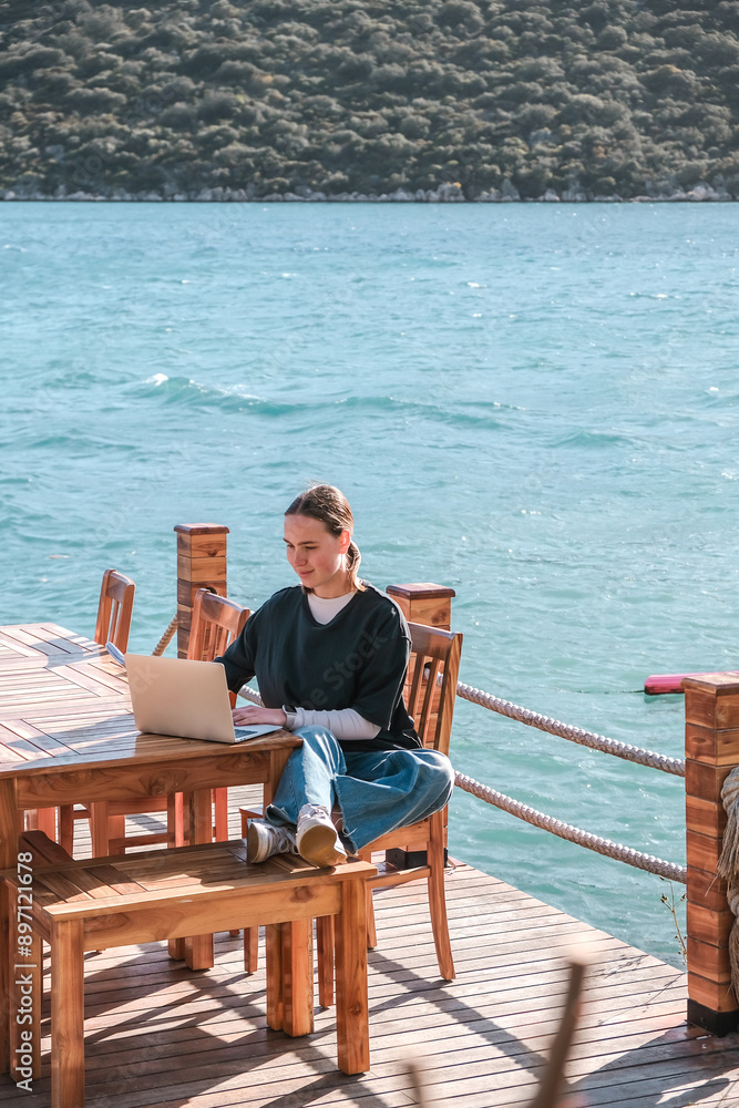 Work,Remotely work.freelancer works remotely home.cozy workation, remote work,leisure, work life balance,digital nomad, workation,work travel,remotely work.Travelling.Work vacation remotely