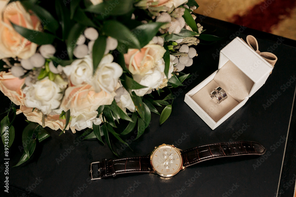 A watch is on a table next to a bouquet of flowers and a white box. The watch is a gold and black one