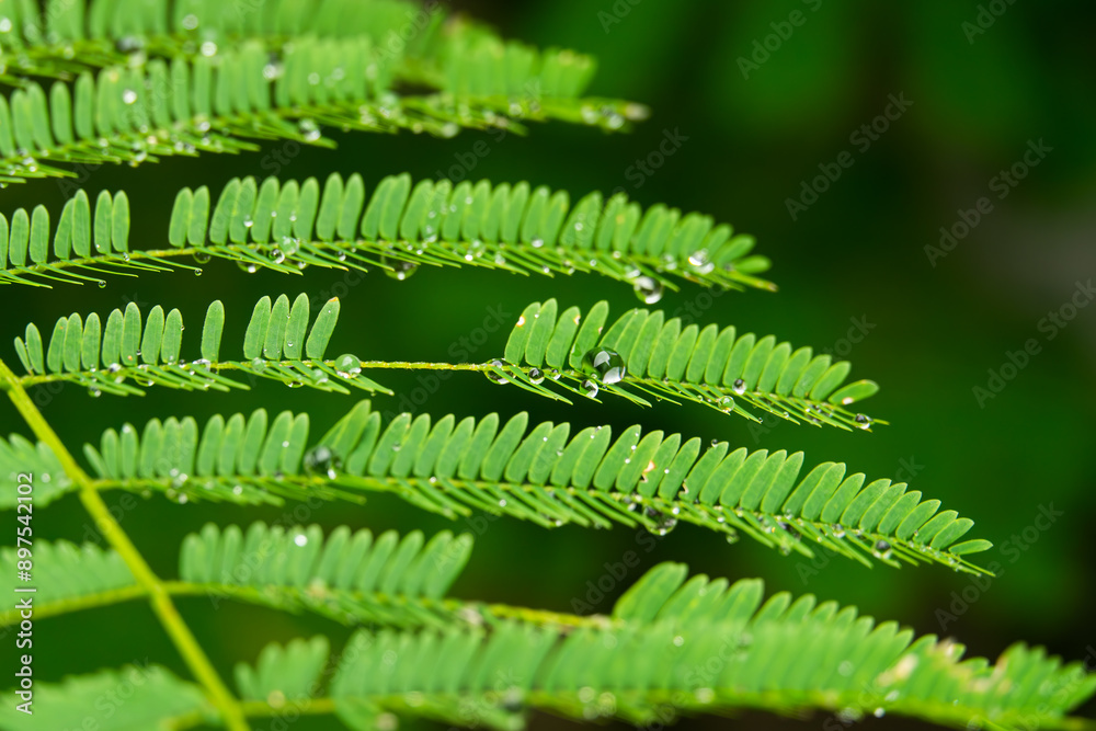 A leafy green plant with droplets of water on it. The droplets are small and scattered, giving the impression of a light rain. The plant is lush and vibrant, with a sense of freshness and vitality