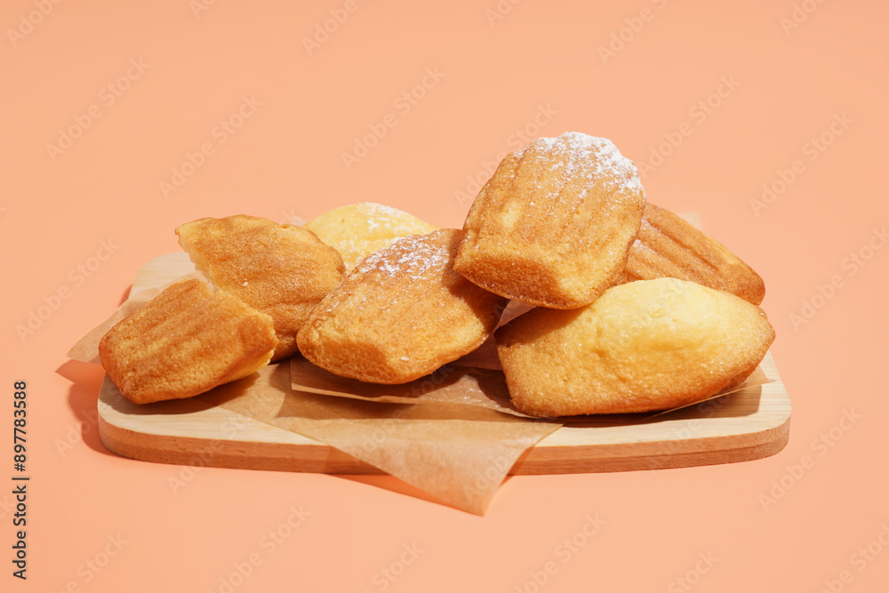 Wooden board with delicious madeleines and powdered sugar on orange background