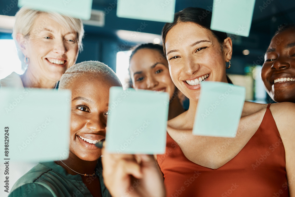 Office, meeting and glass wall for teamwork, planning and sticky notes with smile for report. Women, diversity and team for small business, discussion and collaboration for partnership or b2b project