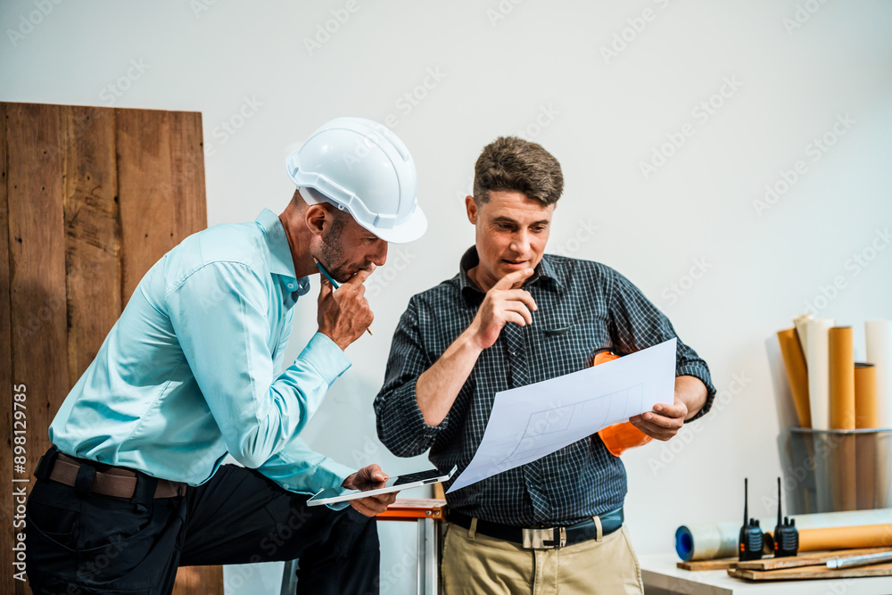 A Caucasian male engineer and an Italian male building contractor are planning and talking at a desk, reviewing house plans and a model of a house with wooden textures for renovation.